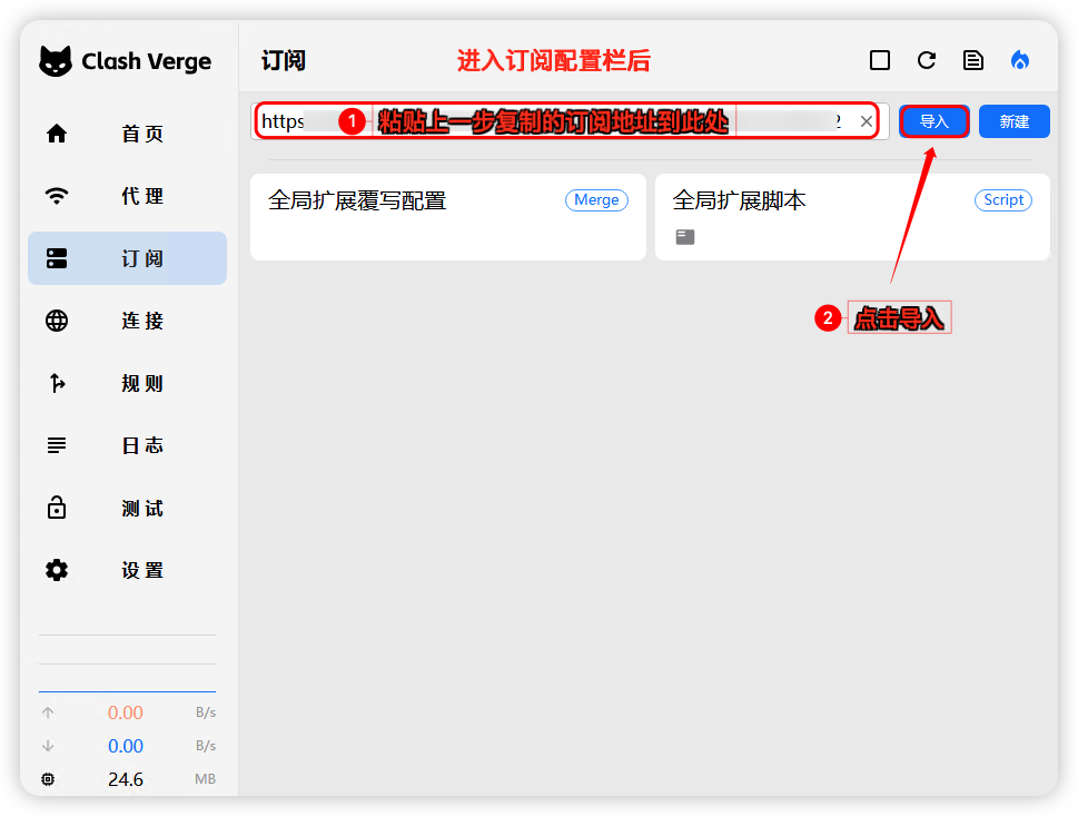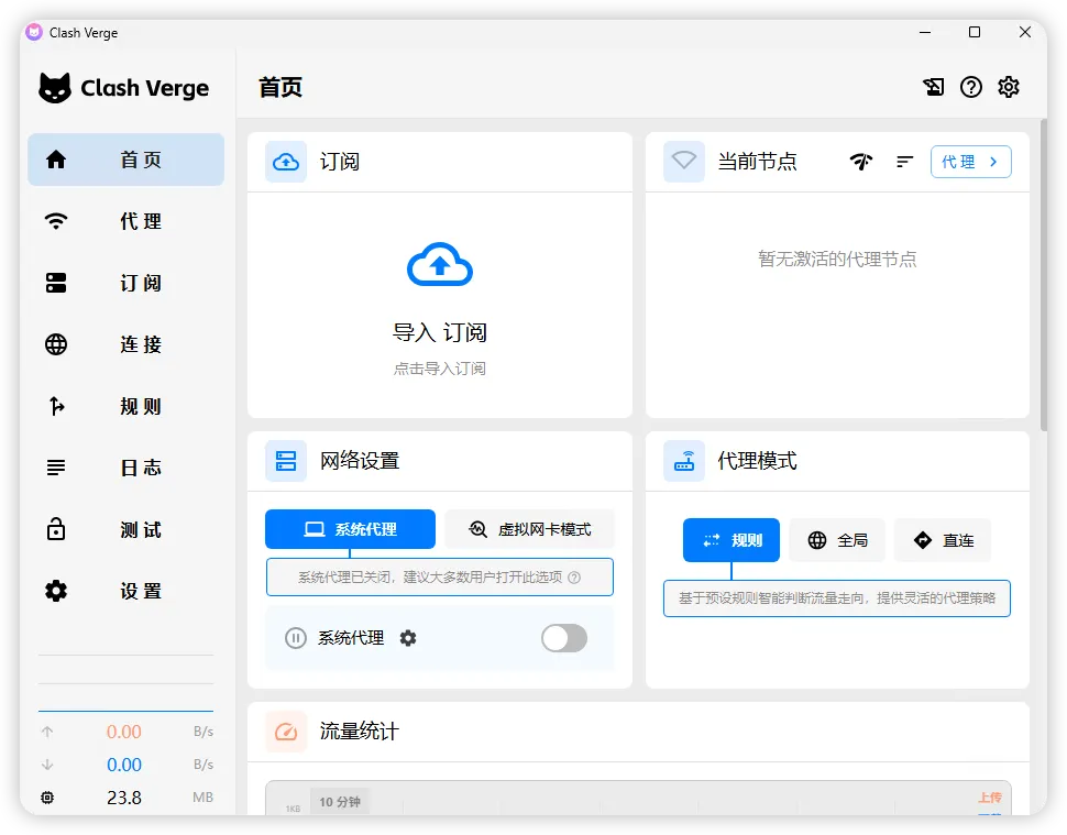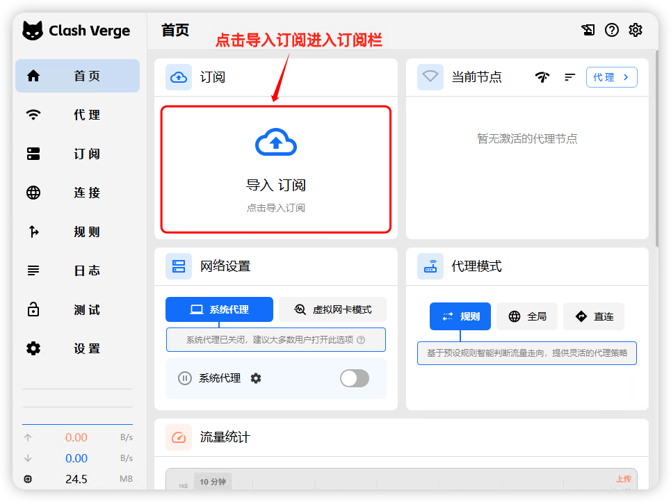 >如安装杀毒防护软件,请卸载 (360 QQ安全管家无需卸载) 非校园网或公司内网使用,很多内网会禁用国外网络,如果是家庭网络使用不了,请检查路由设置,安全等级要调成最低 关闭设备防火墙 ## 一、下载Clash Verge软件 >### [点击下载安装](http://wwayr.appboz.com/iADxK3i3e6bg "点击下载安装") >### [下载地址2](http://82.156.241.60:666/stablesurf/Clash.Verge_2.4.5_x64-setup.exe "点击下载安装") >### 👉 如下载不了请联系右下角客服 ## 二、安装Clash Verge软件 下载到本地,进行安装,安装完成后打开软件  ## 三、导入并连接节点 **先官网注册账号 (账号独立使用 稳定 安全)** ### 1、打开飞迅加速,登录后 进入仪表盘,点击一键订阅-复制订阅地址(请先确定自己有订阅套餐在导入,不然导入不了) 请先关闭设备上现有的代理软件的开关打开官网 打开官网 https://www.feixunjiasu.com 备用地址:https://www.feixunjiasu.net 如都打不开请访问 [http://129.204.9.118/](http://129.204.9.118/) 或 [http://115.159.204.42/](http://115.159.204.42/)   ### 2、 打开Clash Verge - 首页 - 点击导入订阅 - 将复制的订阅地址 填写到红框位置,点击导入   ### 3、 导入成功后默认会自动选择刚刚导入的订阅(如没有自动选择需手动选择),注意选择后左侧会显示蓝色  ### 4、点击代理,这里有三种连接模式 **全局模式** 选择这个后所有网络都走国外,国内百度、淘宝都会是国外网络,如果是使用国外软件,建议选择这个Global模式 **规则模式** 选择这个后 国内网络还是走你本地网络 比如淘宝、百度还是你本地网络,但是谷歌、油管等,都是走国外网络,选择规则模式某些网站或者国外软件可能会访问不了 可以优先选择全局模式 **直连模式** 选择这个后 所有网络都走你本地,这个是访问不了谷歌等国外网址的 所以不能选这个。 这里我们选择全局模式, 手动选择下方未超时的节点  ### 5、回到首页,把系统代理的开关打开,这样就可以访问国外网络了  ### 浏览器访问 [https://google.com](https://google.com/) 打开网址测试,能使用说明线路连接成功,开始快乐看世界~  ### 6、如果不使用了,这里在关掉  # 无法使用 常见问题: ==①节点全是红色== 把电脑时间改成和手机(北京)时间一致 注意,设备必须和北京时间误差不超过1分钟 关闭电脑防火墙  ==③Chat GPT用不了== 选择节点线路带GPT字样,开启全局模式 ==泰国线路优先(干净)==关闭浏览器或APP重新进入
